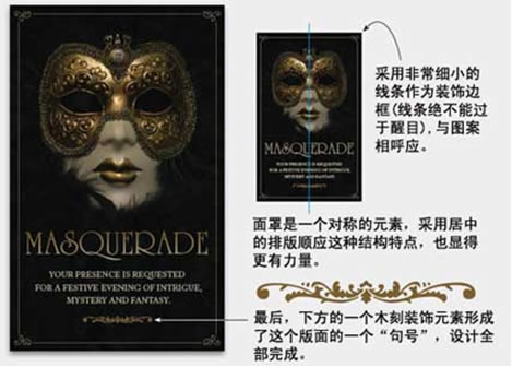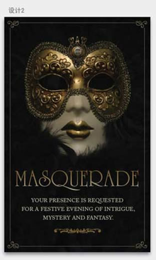 對(duì)于第二個(gè)設(shè)計(jì),整個(gè)設(shè)計(jì)充滿一種宮廷、神秘及奇幻的氣息。我們所使用的University Roman字體在這個(gè)化妝舞會(huì)的邀請(qǐng)卡名設(shè)計(jì)中同樣發(fā)揮出色。