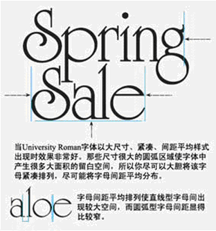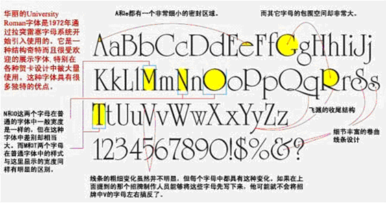 University Roman字母的構(gòu)成顯得非常不規(guī)則,而且有很多裝飾細(xì)節(jié),這注定了這種字體具有良好的展示性及討人喜歡的面孔,但卻并不適合作為正文閱讀。要確保在使用時(shí)字體尺寸夠大。