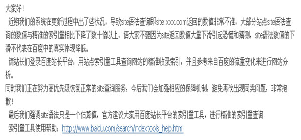 以上是筆者對于昨天所發(fā)布“關(guān)于site語法查詢的問題”公告的一些感想,也在公告中訴說到“今后我們會加強(qiáng)相應(yīng)的保障機(jī)制”、希望每次修改算法的時(shí)候要站在我們站長的角度上想想,其實(shí)我們這些苦逼的站長做個(gè)站也挺不容易的。